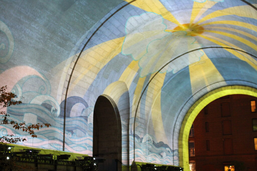 About the Project “Time Divides” by Integrated Visions was part of ‘Codex Dynamic,’ curated by Leo Kuelbs and John Ensor Parker. The massive projection mapped art piece spanned over 30,000 continuous square feet of the Manhattan Bridge anchorage and archway in DUMBO, Brooklyn, NY as part of The DUMBO Arts Festival 2012. The piece received the Festival’s Grand Prize and was recognized as Best in Show as well. Projection and media server support provided by World Stage, also the event’s main sponsor.